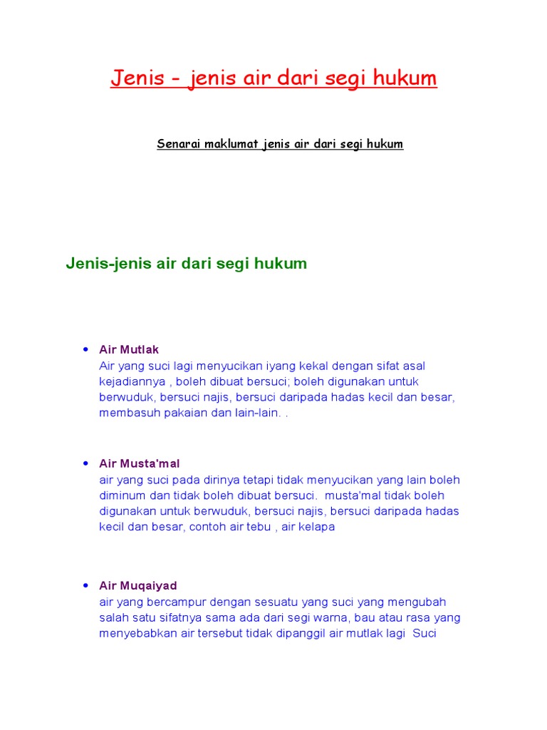 √ islamic base pass quality & checked by advisor, read our quality control guidelance for more info. Artikel ini akan membicarakan secara lengkap mengenai soal taharah pembahagian jenis air dalam islam. Massa jenis air merupakan rumus awal untuk pembuatan kapal laut. Di dalam hadist yang lain, rasulullah juga pernah menyampaikan bahwa air liur anjing adalah suatu yang najis dan wajib untuk membersihkannya dengan tanah sebanyak tujuh kali. Jenis air ini terbagi ke dalam dua bagian, yaitu air musta'mal dan air mutaghayar.