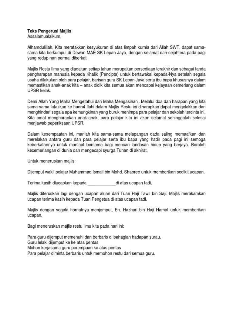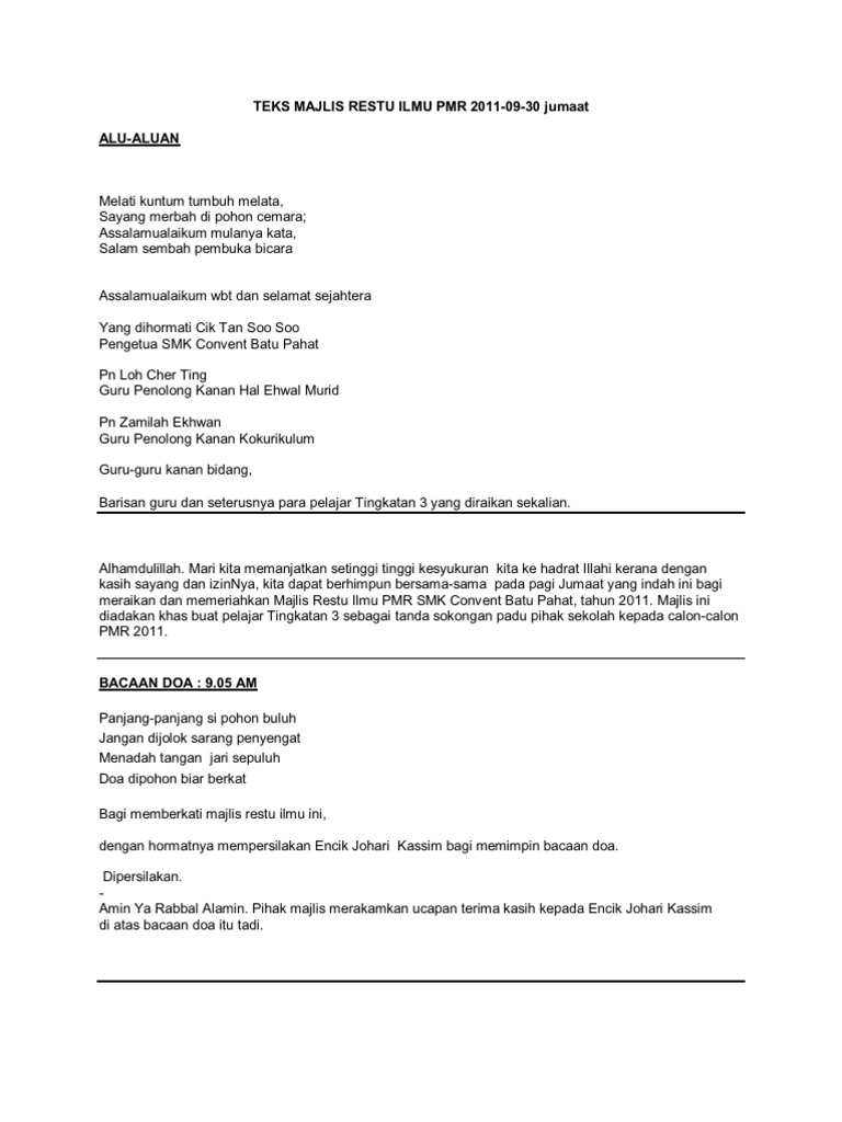 Majlis restu ilmu merupakan majlis yang diadakan setiap tahun sebelum menjelang peperiksaan sebenar sijil pelajaran. Terima kasih pengerusi majlis, bismilah.wassalam tuwassalam waalaasyrafil ambiya iwalmursalin waala alihiwasohbihi ajmain. Assalamualaikum wbt … dan selamat sejahtera. Majlis bacaan yassin reda ilmu tingkatan 5. Terima kasih pengerusi majlis, bismilah ….wassalam tuwassalam waalaasyrafil ambiya' iwalmursalin waala alihiwasohbihi ajmain.