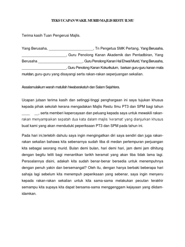 Majlis Restu Ilmu from imgv2-1-f.scribdassets.com Majlis restu ilmu merupakan majlis yang diadakan setiap tahun sebelum menjelang peperiksaan sebenar sijil pelajaran. Encik che kamarudin bin che mohd zin, guru besar sk taman molek, yang dihormati, puan rosni binti gani, pk pentadbiran. Majlis perasmian penubuhan mpm telah disempurnakan oleh. Sorry, aku pakai baju pj hari ini. Awang puan penolong kanan pentadbiran pn azizah bt mamat, penolong kanan hal ehwal murid, en baharudin b. Majlis restu ilmu sksbt upsr 2015. 03 sep 2013 leave a comment. Encik ahmad bin mohd ali pen.
